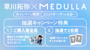 キャンペーン期間中、対象商品であるMEDULLA×草川拓弥の限定コラボ5点セットを購入いただいた方には、草川拓弥限定トレカ2種類と限定クリアファイル1種の合計3点を数量限定でプレゼント。